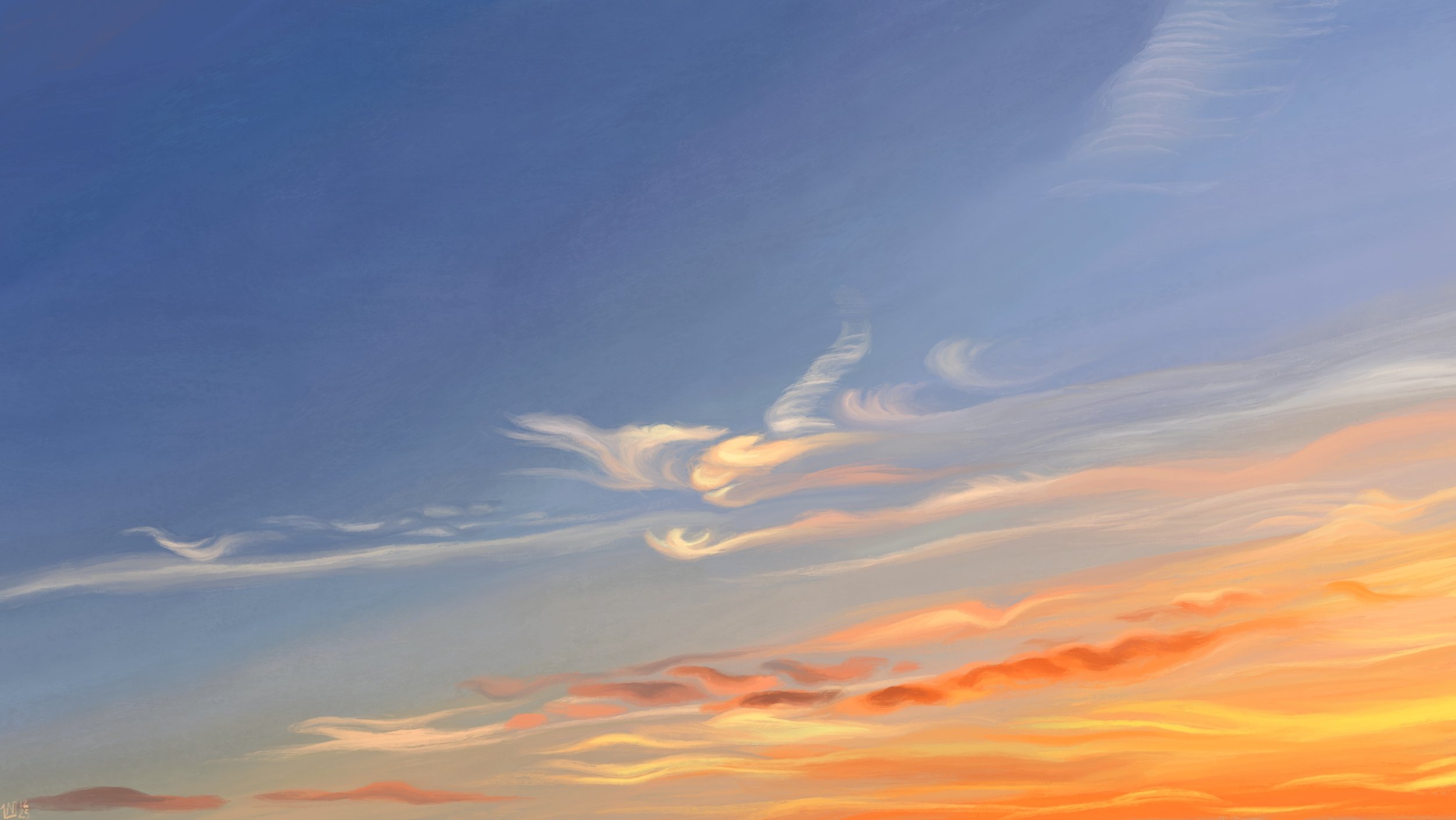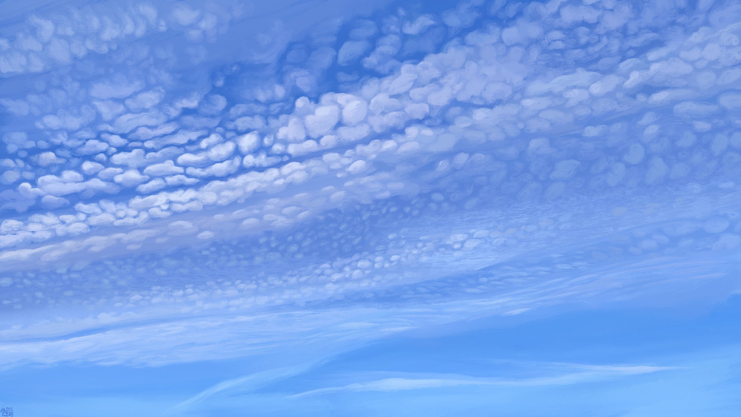We report: when the clouds form out of the ether this way, we get the feeling we are being shown the invisible mechanism that holds the sky together. The scales of this mackerel sky are rapidly joining together, and we can feel the air getting more humid. We unfold our raincoat.