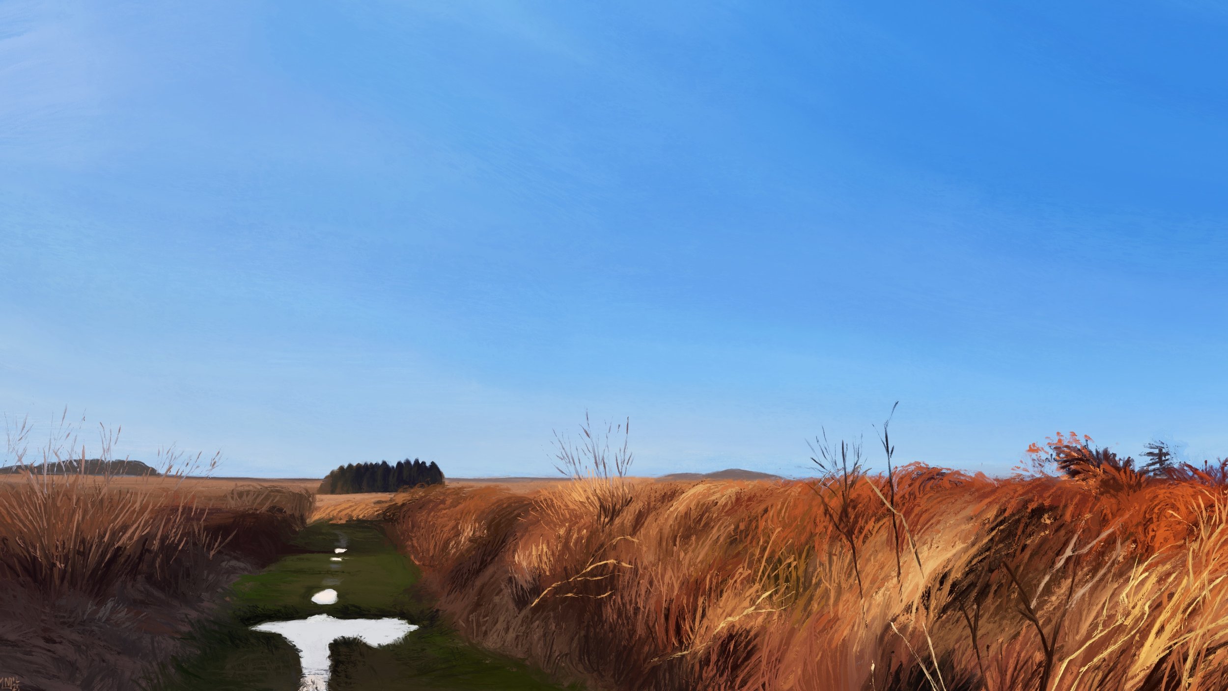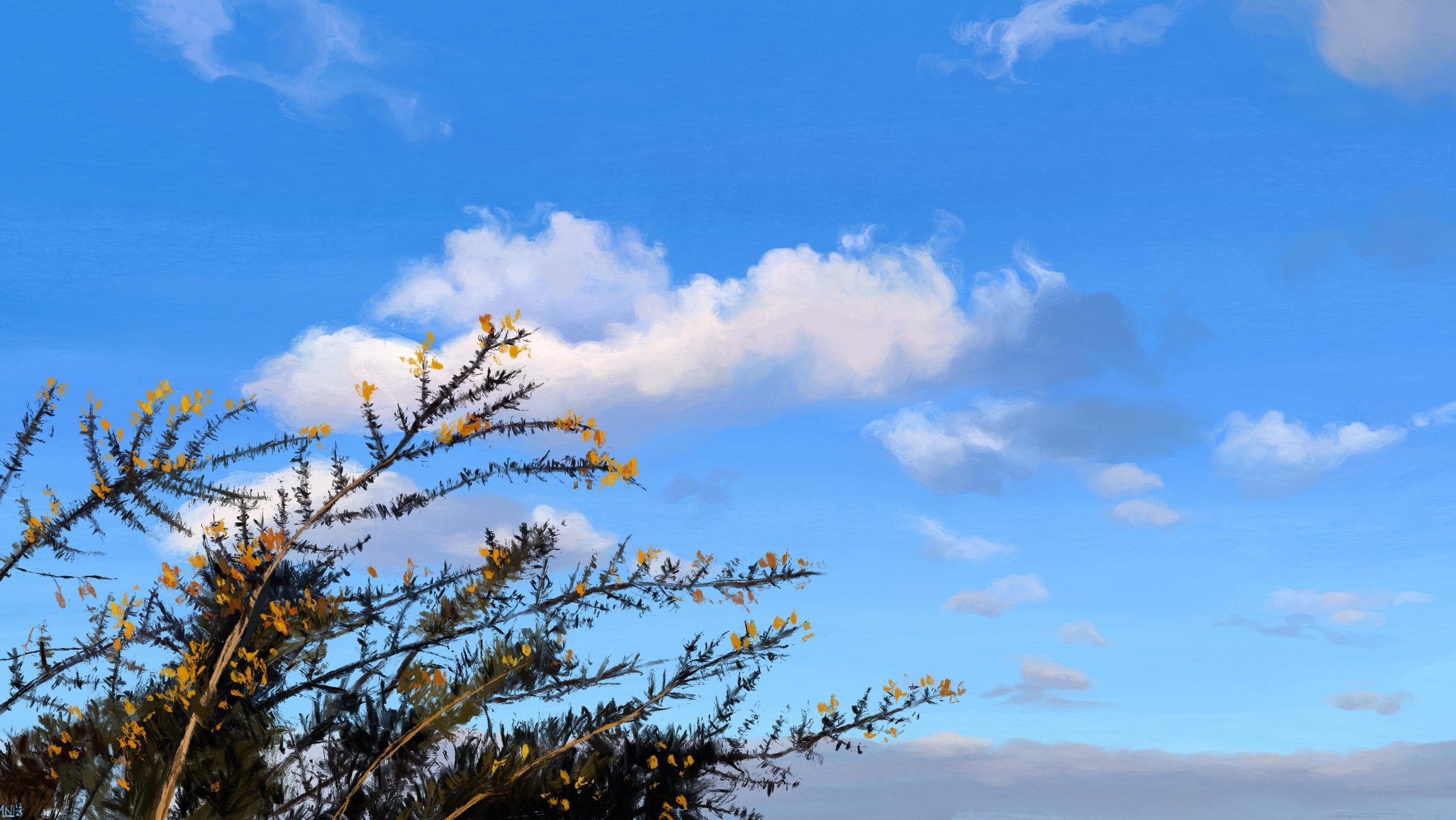 We report: the gorse shrubs are flowering under the cold sun in fat yellow blooms. The wind carries a smell of honey when we walk by too close, and the thorns catch in our hair and clothes. The blue sky falls in deep puddles in the middle of our path. We have to step around it.