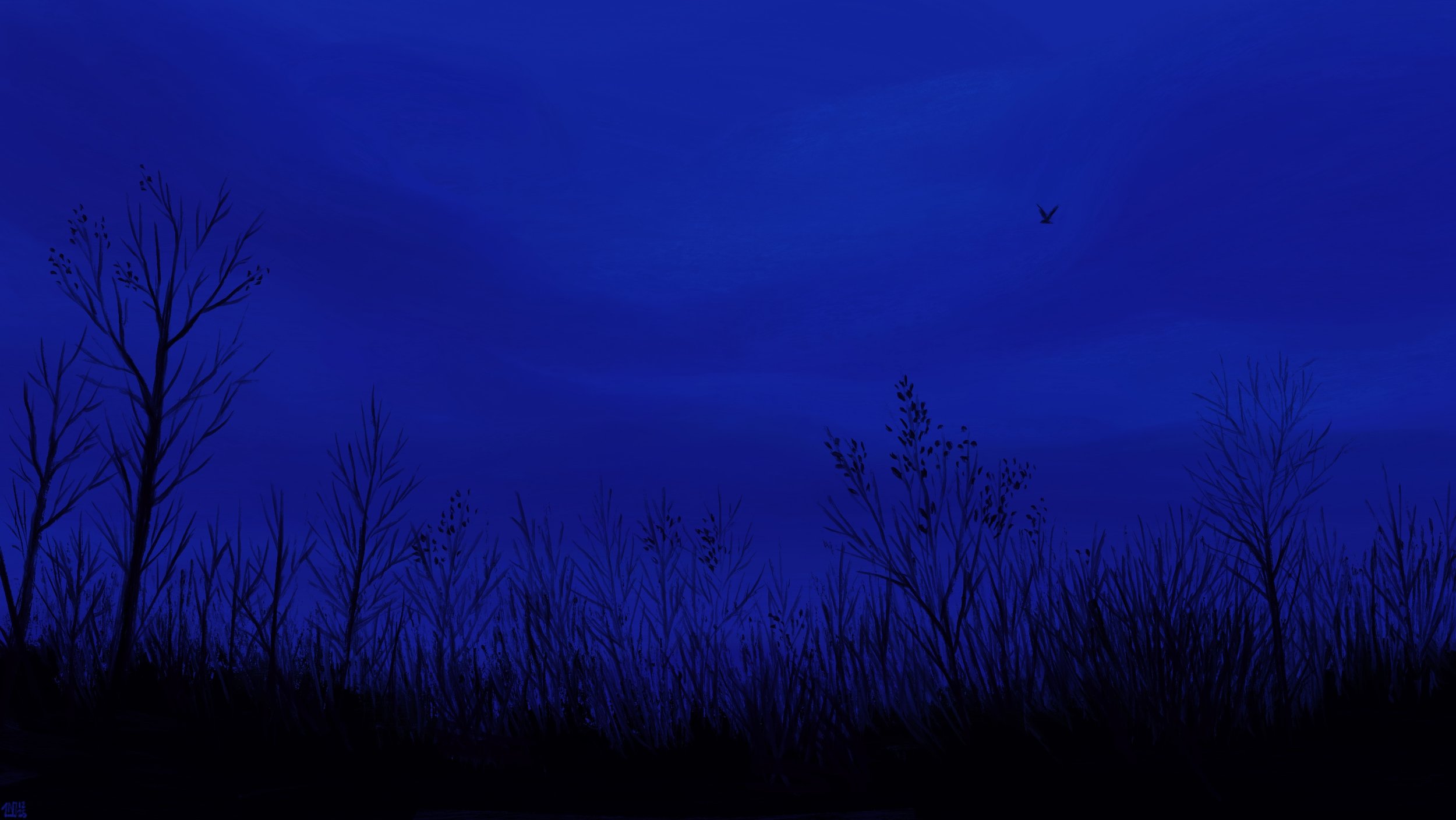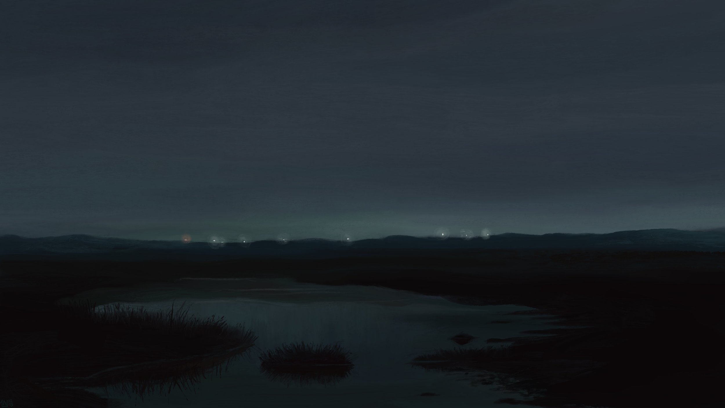 We report: in the depths of bog country, the will-o’-the-wisps of distant city lights are keeping the sky three shades above full darkness. This is not enough light to observe the night life we hear, no matter how much we squint. We still think we see things move above the water.