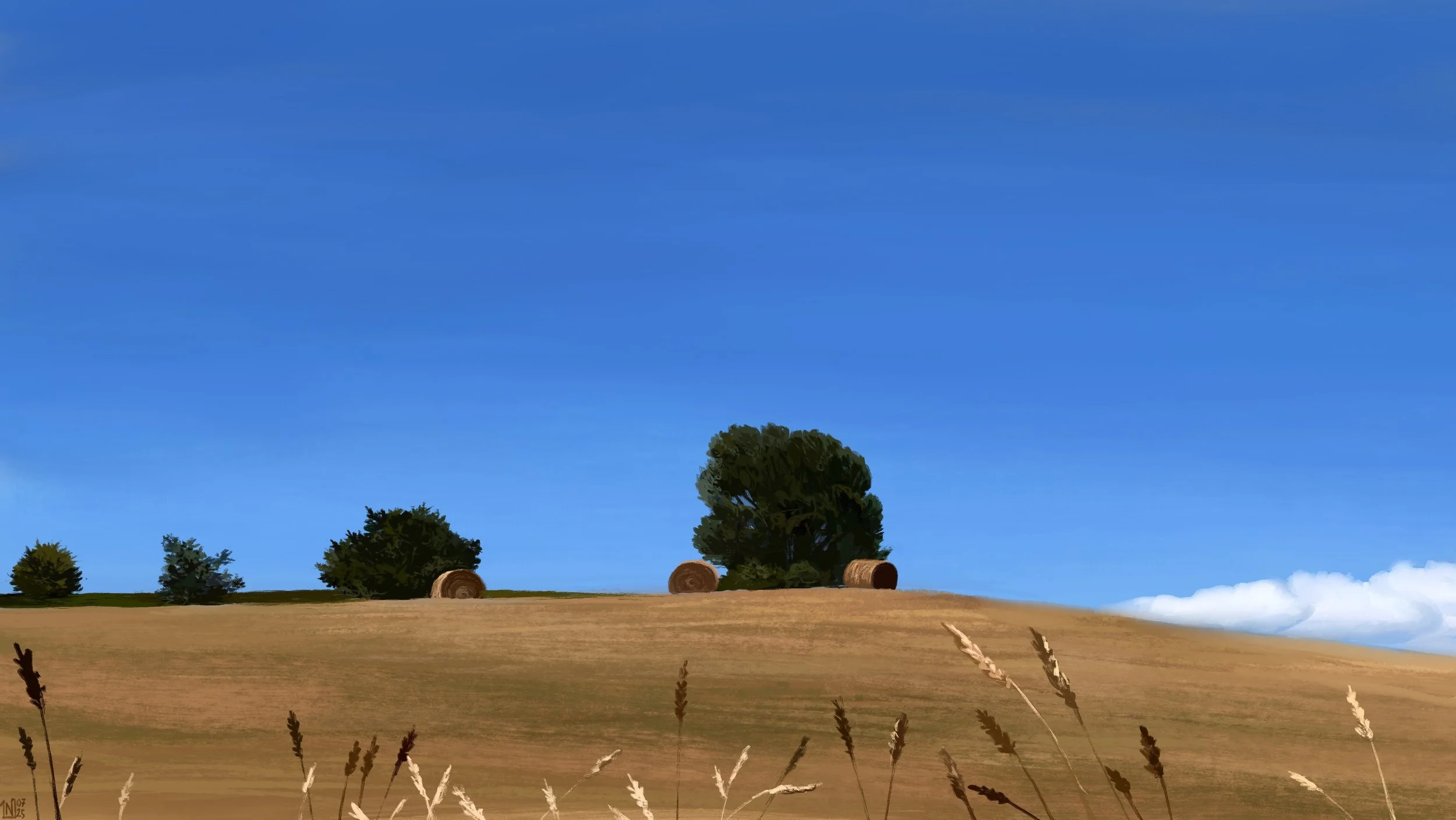 We report: the sky is wide open, and the sun is somewhere above our head, too bright for us to try and look for it. Bales of hay have been appearing on top of the hills, and the remaining grass underneath has been left to yellow in the heat. A bit of wind steals our hat.