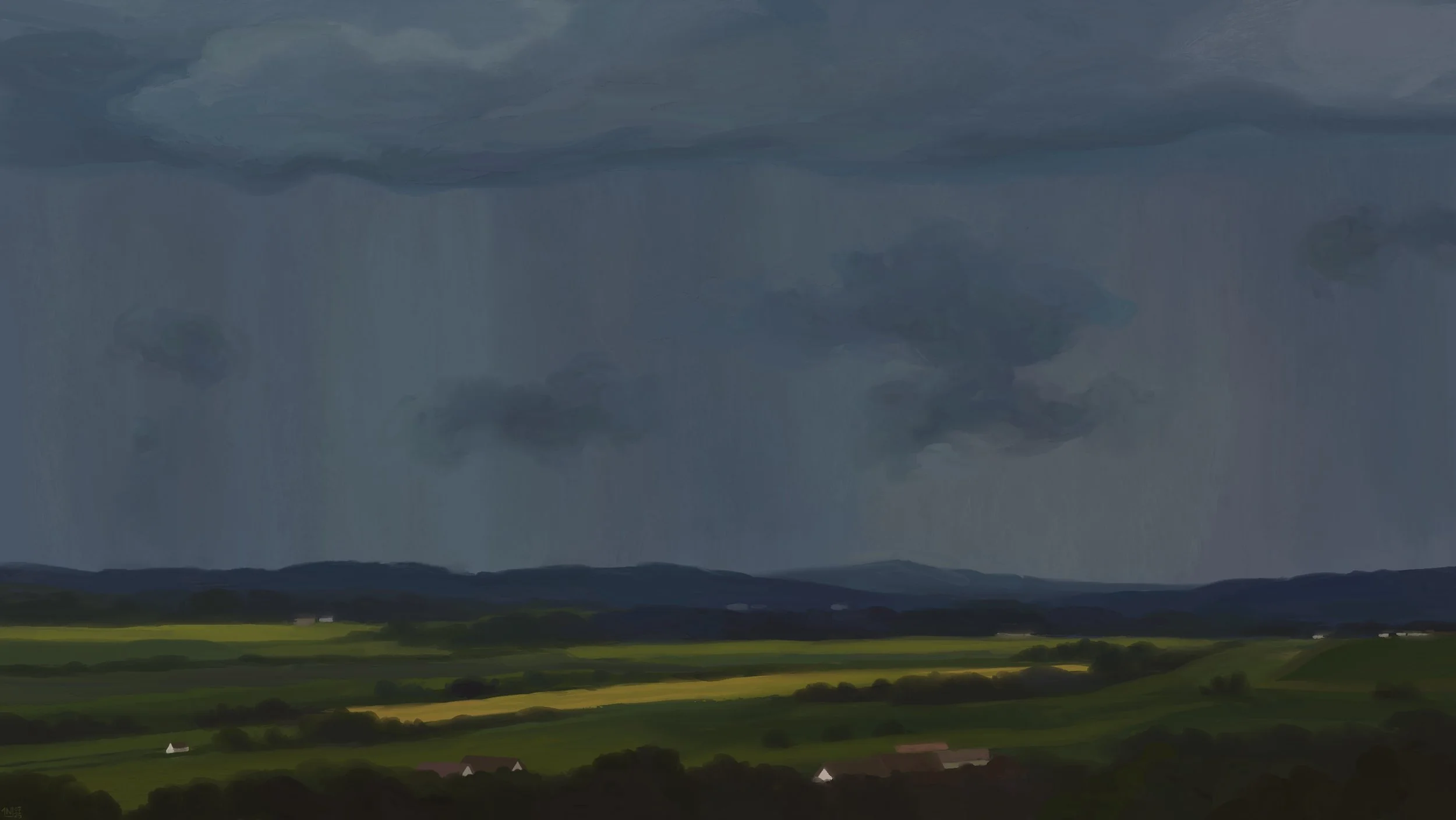 We report: the storm comes by way of septentrional winds, and it does indeed feel particularly northern for a reason that escapes us. The rain is coming straight down in dark, heavy drops that colour the landscape like ink - a few of them enough to render us soaking wet.