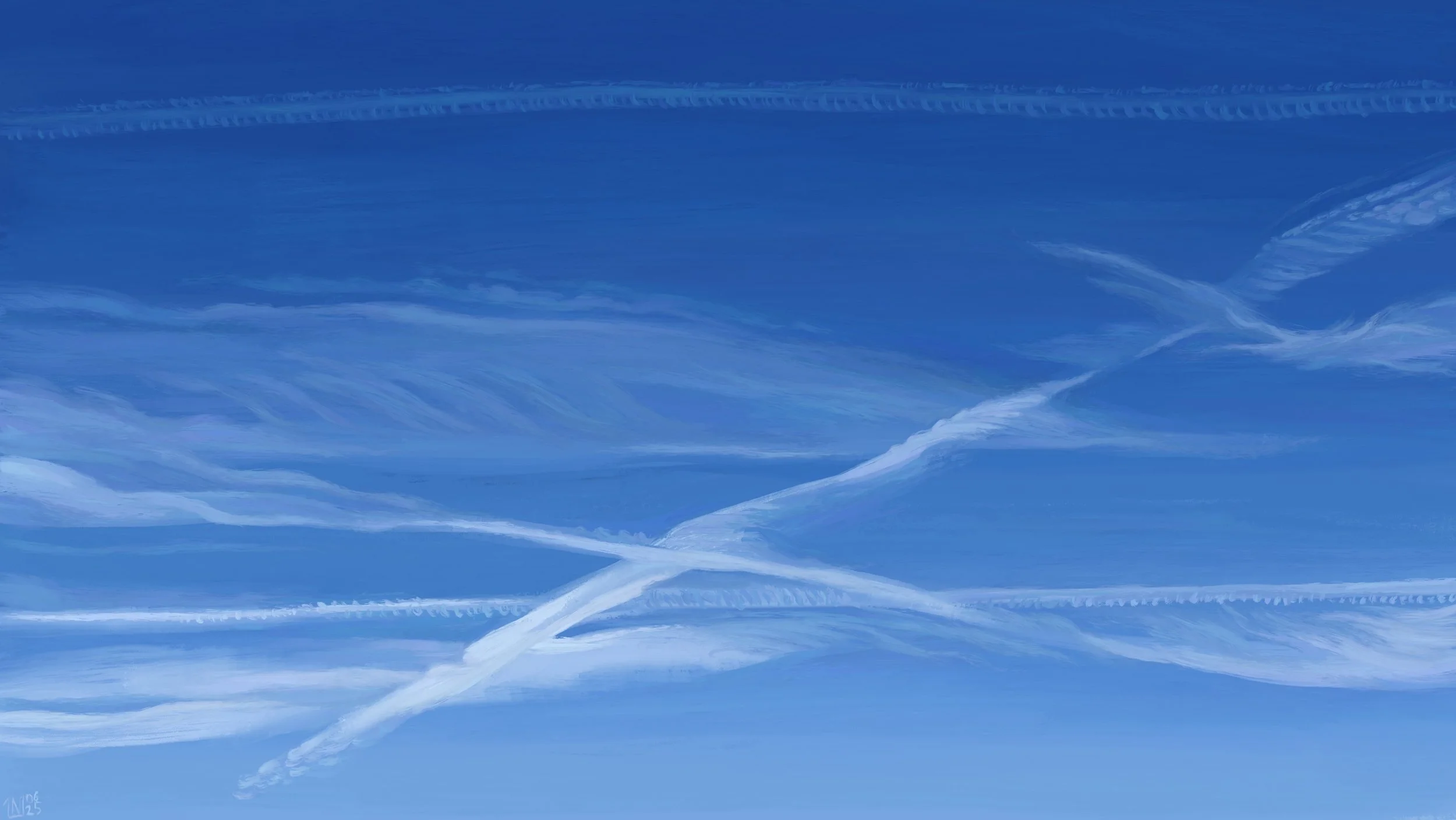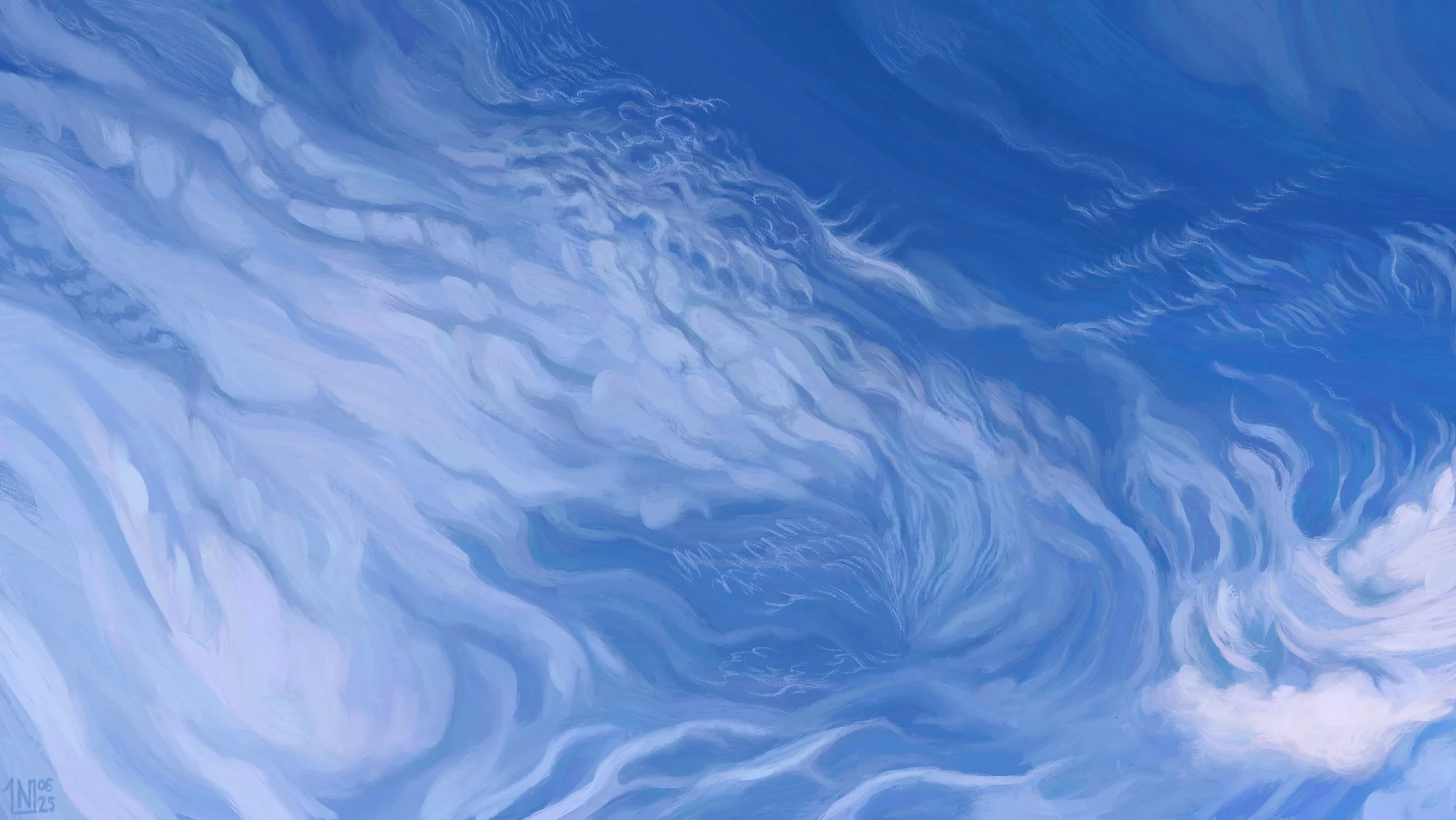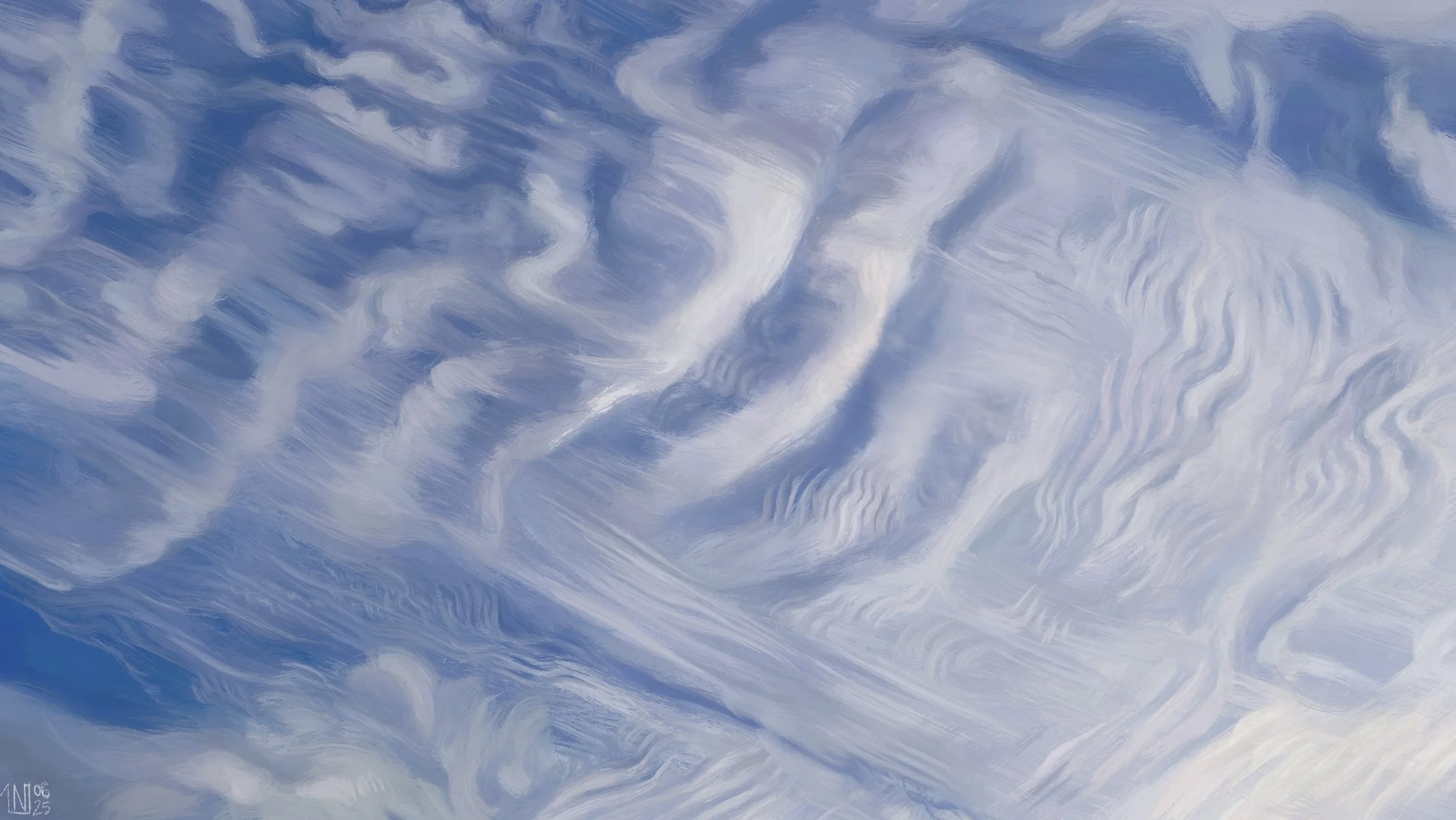 We report: the sky has frozen into the motion of the wind, all the ways across, turbulence and all. This quilt is stitched in sunshine, ice, and time - fragile pieces of fabric, and it is no wonder that it is already starting to unravel. The waves get rowdier among the clouds.