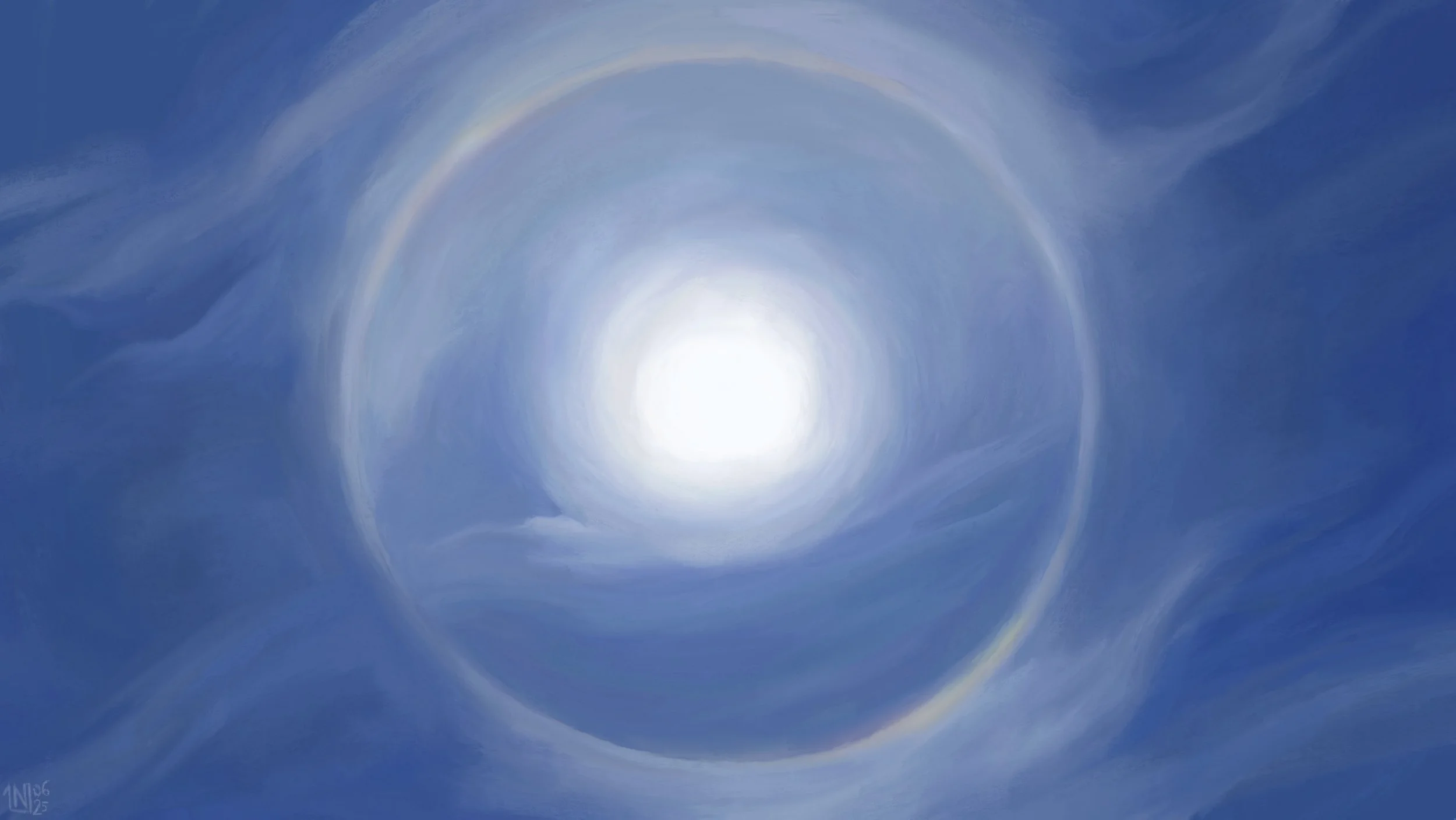 We report: this is the full 22° halo that we have been looking for all day, though we did notice a lone sun dog earlier. We feel justified in thinking the cirrus layer was just right for its formation. We wonder if it is true that these halos announce future storms.