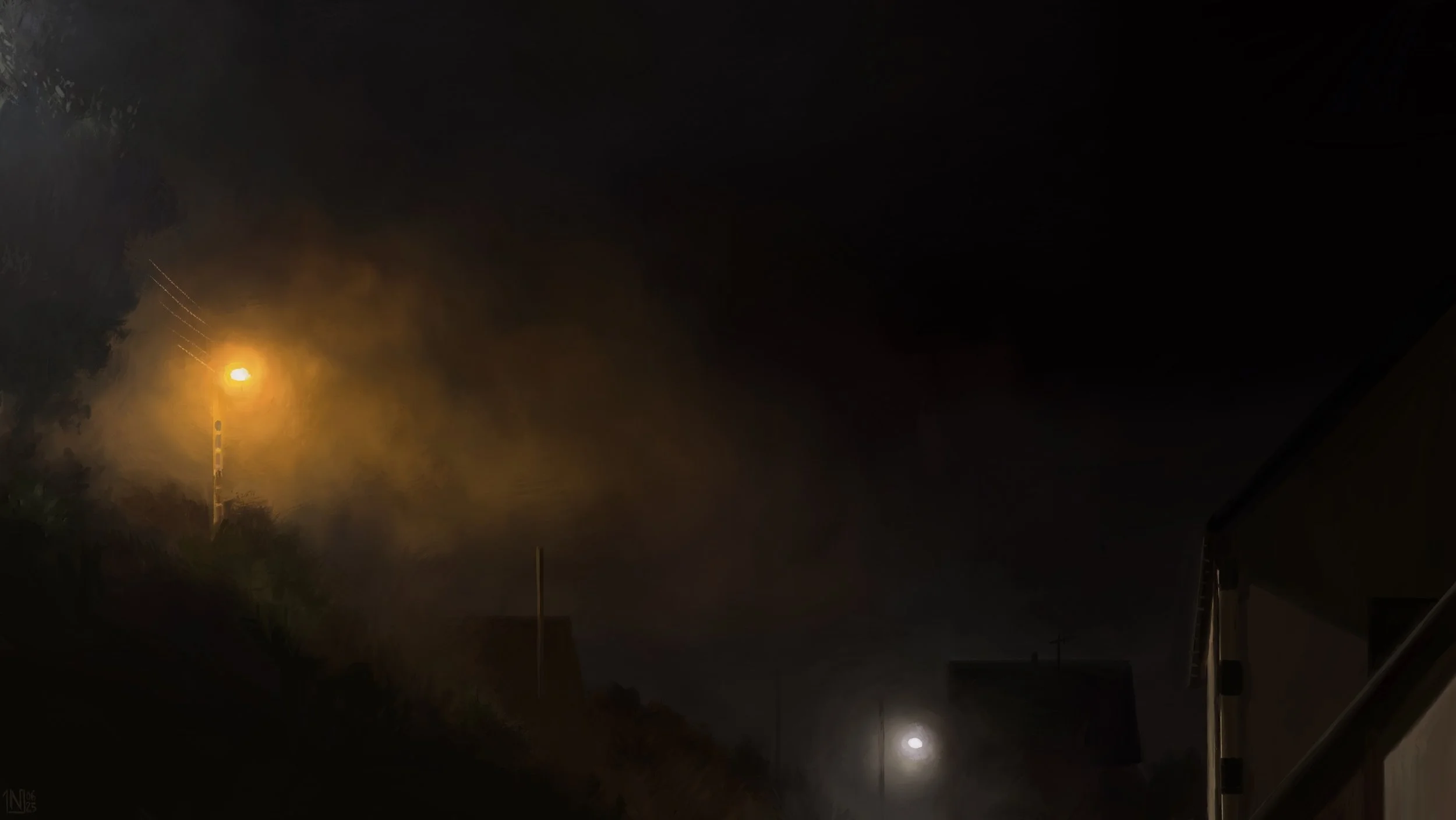 We report: deep in the night, the thinnest drizzle falls in near silence, almost unseen if it were not for the streetlights. We walk through the clouds, the front of our coat catching most of the water as we disturb its suspension. In the morning, it will all look like dew.