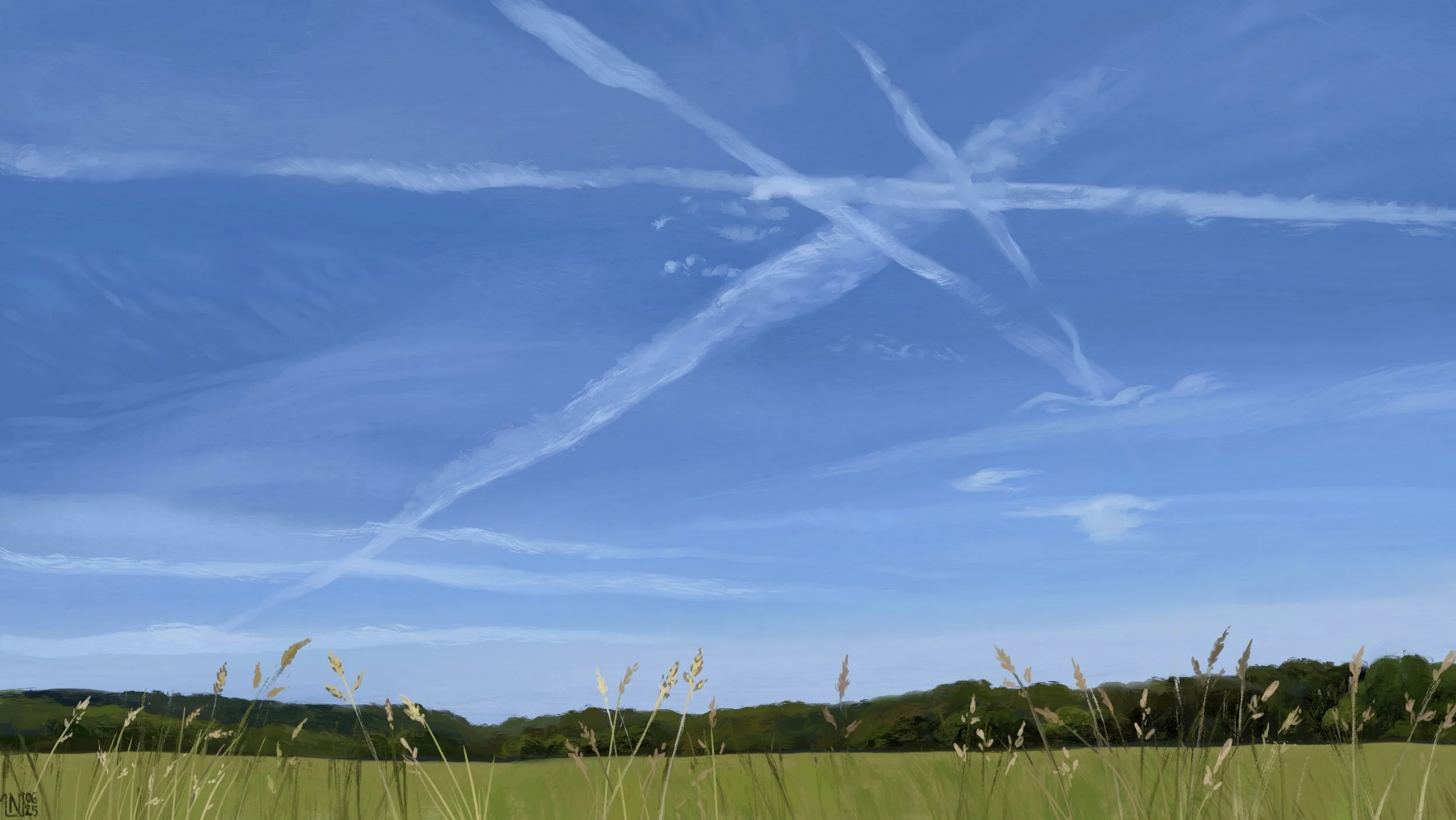 We report: noon light above the growing crops, the sun is pressing down on our face, hot and sharp. There is not a lick of a breeze to displace the mass of heat on the ground, yet we see the soil breathe when we watch with intent. And we watch. And the horizon line oscillates.