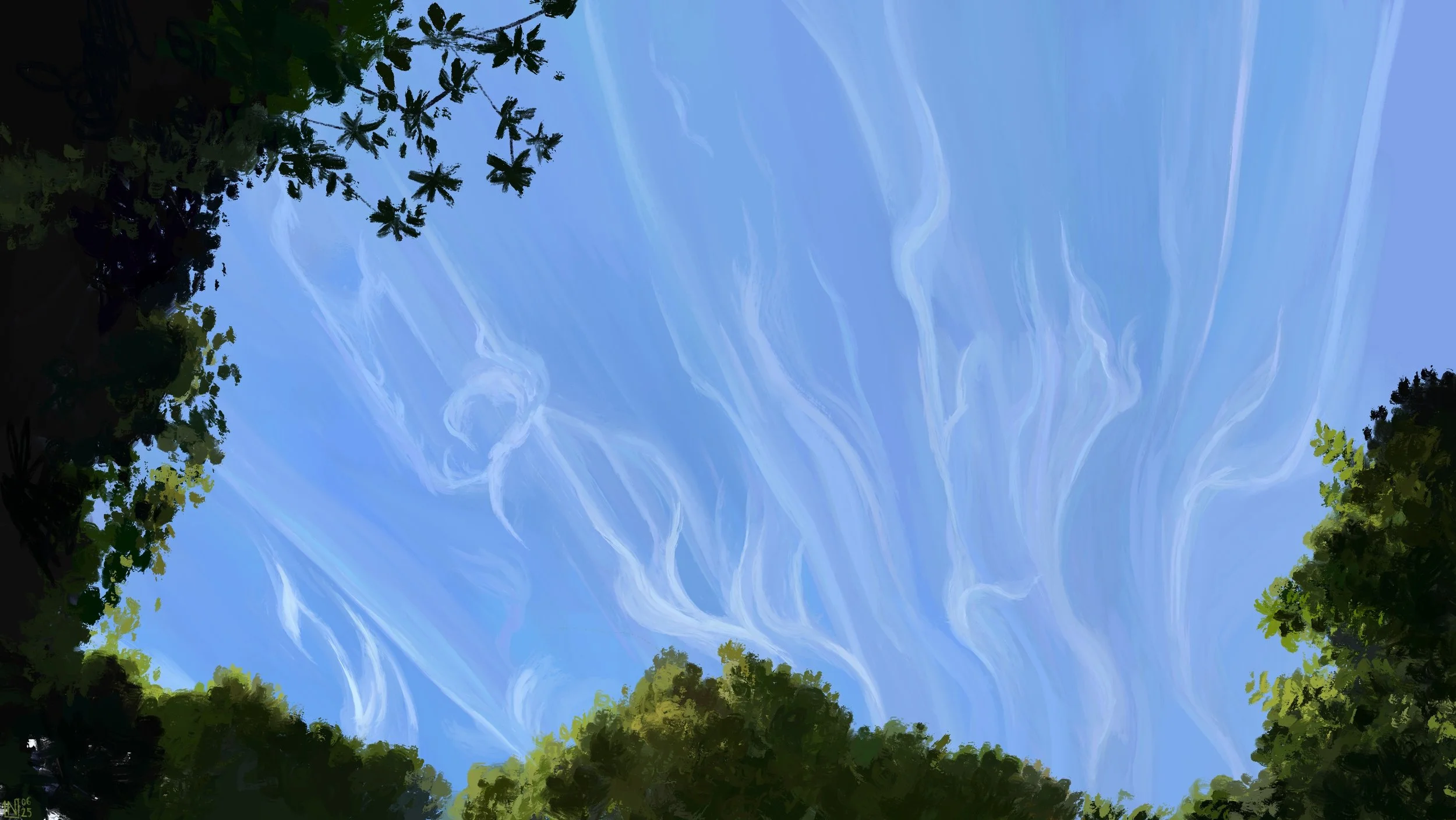 We report: here in the undergrowth, the ground is mottled with sun spots, and the sky only appears where the trees are willing to part. We look up only every now and then as we try to watch our step between brambles and stinging nettles, but the cirrus do not appear to move much.