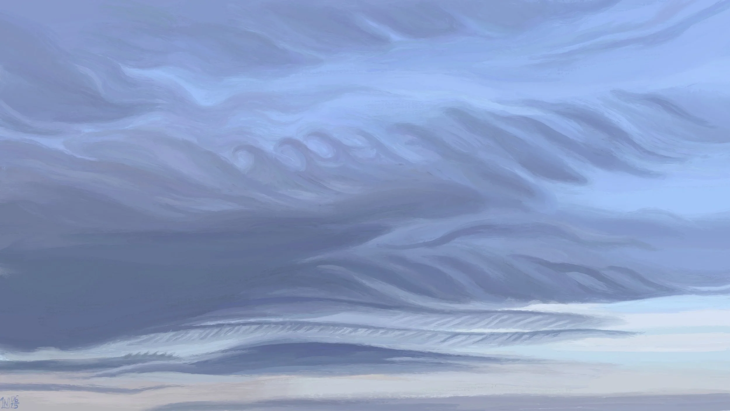 We report a little late in the day: every time we look at the sky, the wind shear is taking it to different places, and simultaneously too. As a result of these contradictory movements, we see a display of the Kelvin-Helmholtz instability, rolling waves crowning the clouds.