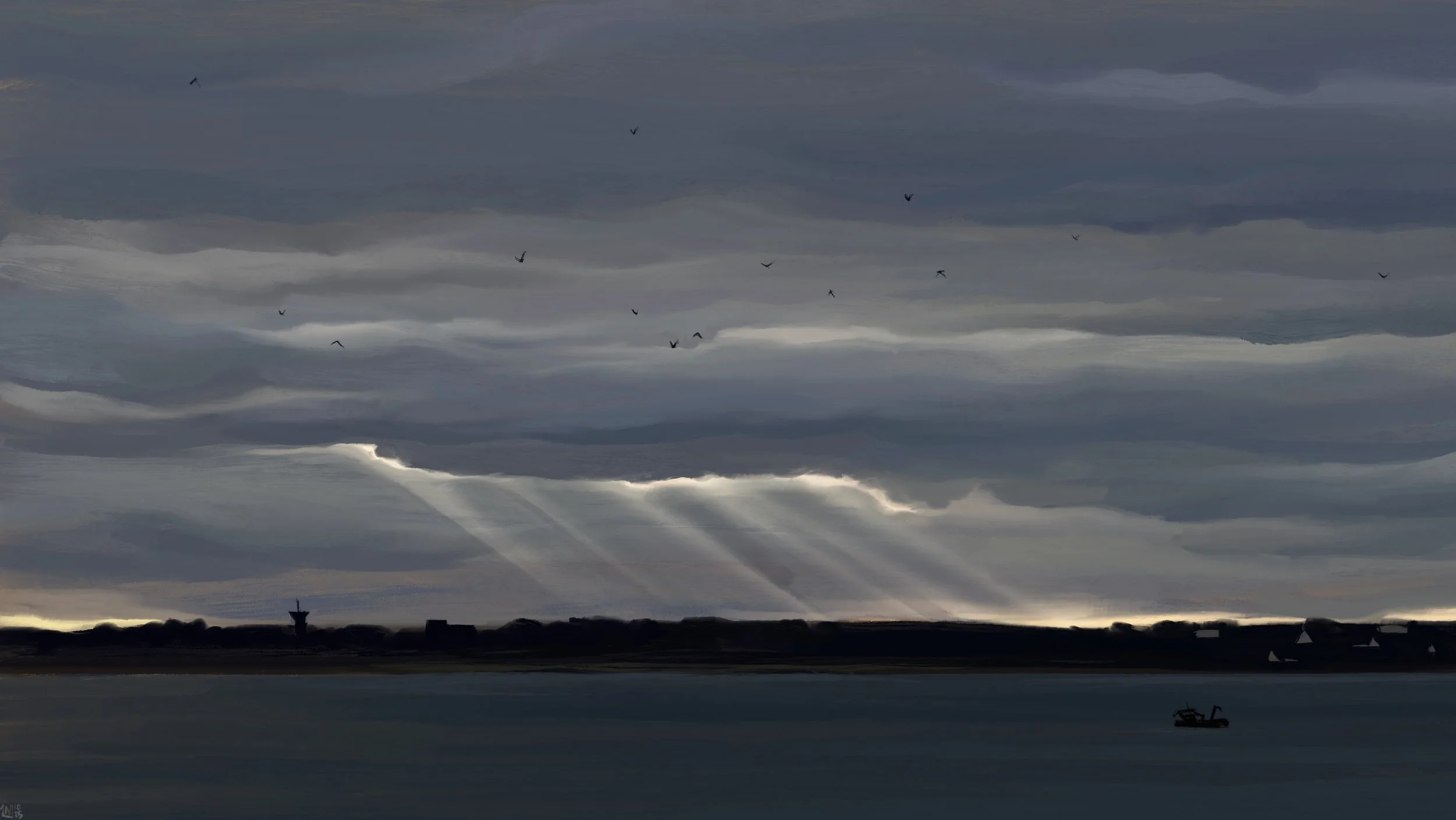 We report: a well of light dances on the water far away. The wind unhurriedly moves the clouds, and the patterns of the shade are predictable. Our expert stirs us towards the sunshine, and we immediately feel the heat high on our cheeks. The seabirds flee on our approach.