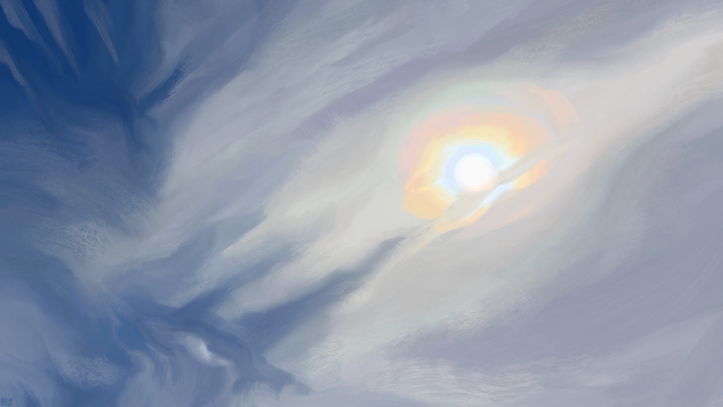 We report: we cannot remember the correct term for this optical phenomenon. We want to call it a halo, so we do, but our expert does remember: it is a corona. The difference is in the way light interacts with the clouds, they say. Refraction for halos, diffraction for coronas.