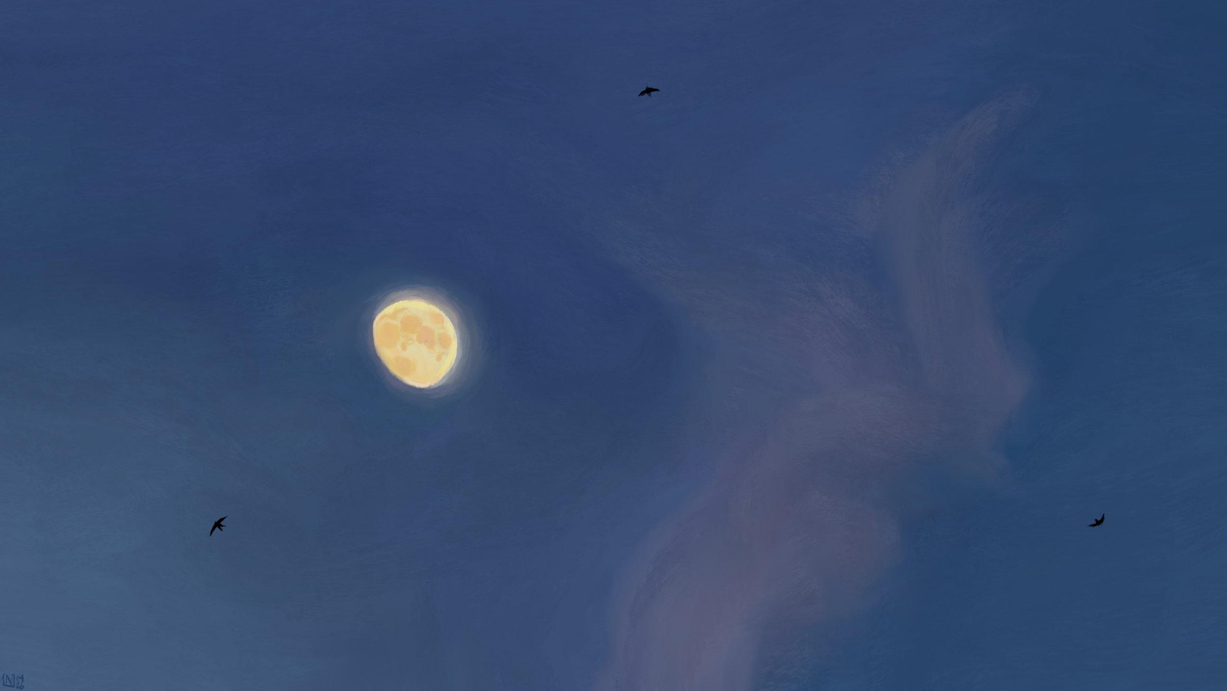 We report: the moon again, now only a few days away from revealing itself completely. The swifts are flying in and out of a swarm of midges, and later, we see a bat as well. The evenings feel more and more alive and busy, like we are missing out when we go to sleep.